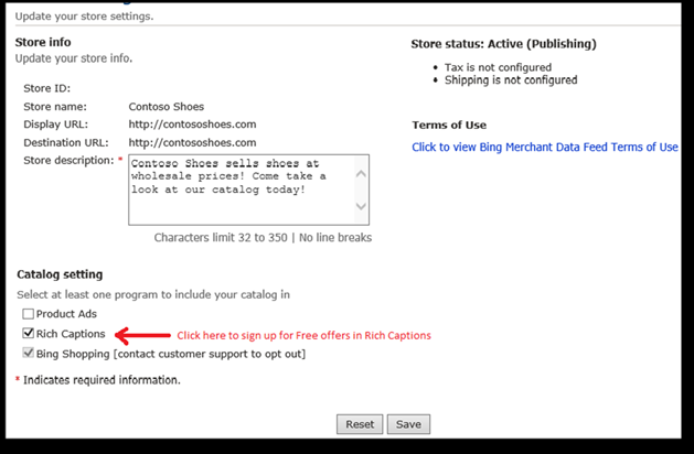 If your store is in the United States and you conduct legal transactions in U.S. Dollars, you are eligible for Rich Captions. You can change your settings on the Bing Merchant Center (BMC). On your store settings, opt-in for Rich Captions under the “Catalog setting” headline. The opt-in feature is designed especially to suit merchant goals, as you do not have to display the rich captions if it would not serve your product to do so.