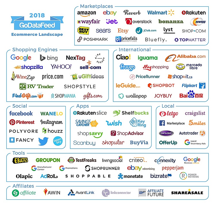 To help you diversify your ecommerce portfolio, we’ve created a graphic of the current Ecommerce Landscape. Use it to identify the channel types you want to focus on and to narrow down the channels where you want your products to appear.