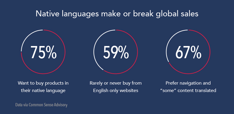 According to research conducted by Common Sense Advisory with over 3,000 participants, localization is critical. In fact, 75 percent of shoppers want to buy products in their native languages, among other important must-haves to make a purchase.