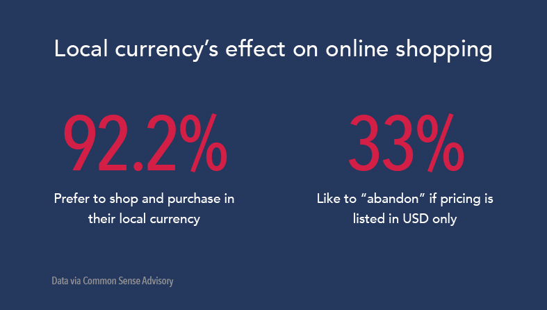 Even if merchants offer products in a consumer’s native language, the price better not be in USD. Over 92 percent of consumers in a 30,000 participant survey said they would not buy a product if the price and checkout was not in their country’s currency.