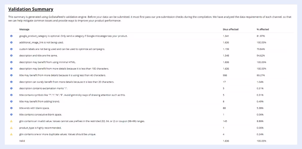 Second, the report provides a comprehensive breakdown of your feed's current state, including feed validation and submission feedback. It highlights any warnings, errors, or areas for optimization. Additionally, you will receive specific recommendations to address these issues effectively and enhance the overall quality of your feed.