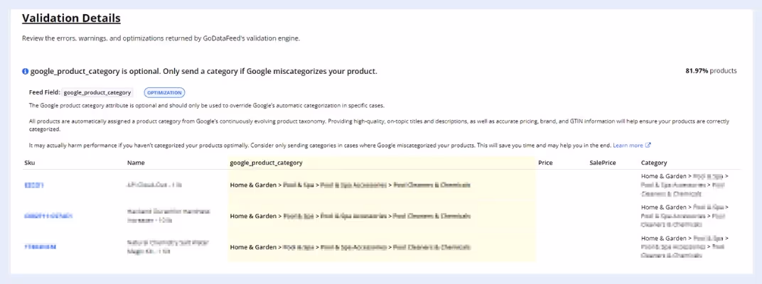 The product data is then checked against the specific requirements of each marketing channel. This can involve a detailed review of the channel's feed specifications and a comparison of the product data against these specifications. Check for: