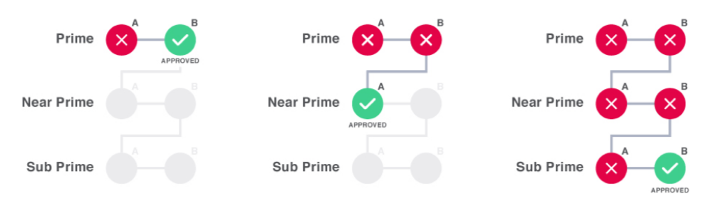 The waterfall method is simple. A checkout financing application is checked against the prime lenders for approval, and if declined, it moves down to near-prime options. From there, sub-prime options are explored and so on, all the way down to lease-to-own financing options. All in a single application with results back in under 2 seconds on the merchant’s site!