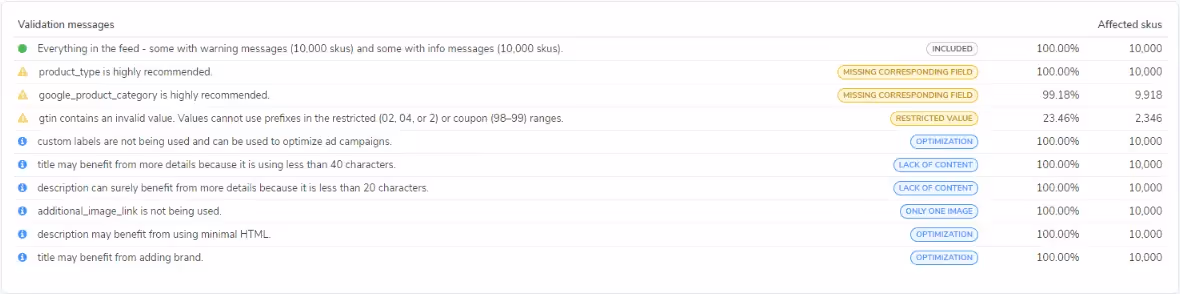 There are two types of messages left: warning vs info. Each with their own important details. Warning messages focus on the non-critical yet important data. These won’t stop your feed from being published yet are recommended. Info messages are completely optional changes that are small optimizations that can help with sales, discoverability, etc.